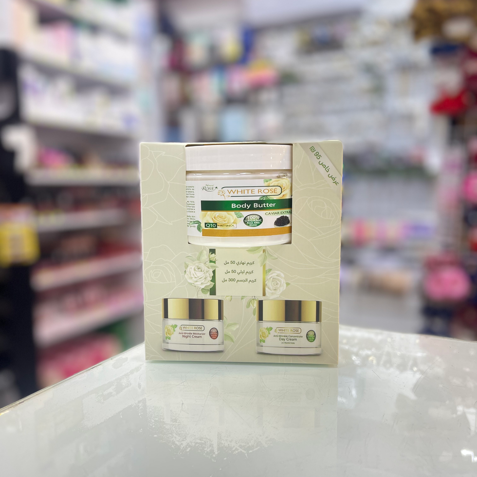 مجموعة White Rose للتفتيح والتغذية – 3 في 1 (كريم نهاري + كريم ليلي + زبدة جسم